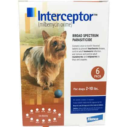 Interceptor is a prescription medication FDA approved for use in dogs and cats. Interceptor is available as artificial beef (derived from pork and soy protein) flavored chewable tablets. The usual dose of Interceptor for dogs 2 to 10 pounds is 2.3mg (brown box), 11 to 25 pounds is 5.75mg (green box), 26 to 50 pounds is 11.5mg (yellow box) and 51 to 100 pounds is 23mg (white box) given once a month year round. The usual dose of Interceptor for cats 1.5 to 6 pounds is 5.75mg (green box), 6.1 to 12 pounds is 11.5mg (yellow box) and 12.1 to 25 lbs is 23mg (white box) given once a month year round. Safety in heartworm-positive cats hasn't been established.