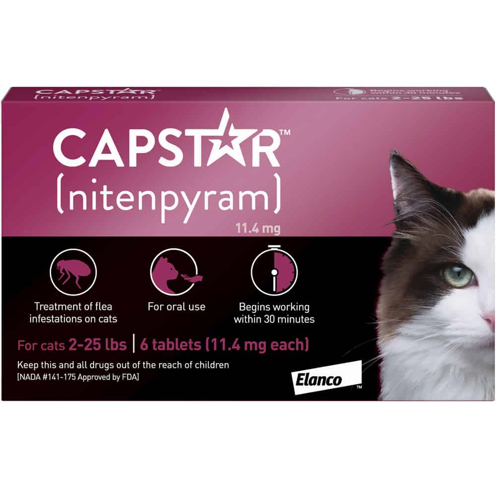 The active ingredient in Capstar is nitenpyram, an insecticide. This oral treatment kills adult fleas quickly. Nitenpyram interferes with nerve transmission in fleas, with no adverse effect on your pet.