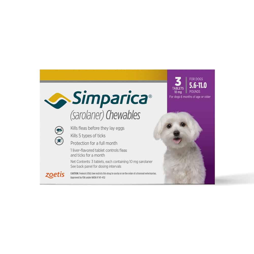 Simparica is used for the treatment and prevention of flea infestations (Ctenocephalides felis), and the treatment and control of tick infestations [Amblyomma americanum (Lone Star tick), Amblyomma maculatum (Gulf Coast tick), Dermacentor variabilis (American dog tick), Ixodes scapularis (deer tick/black-legged tick), and Rhipicephalus sanguineus (brown dog tick)] in dogs over 6 months of age weighing 2.8 lbs and over. Simparica is available as a liver-flavored, chewable tablet. Simparica requires a prescription from your veterinarian.