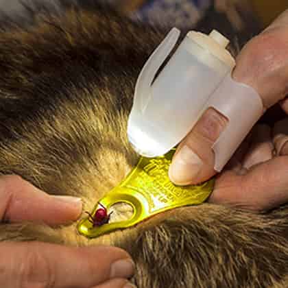 - Once you find the tick in your pet's fur, place the TickKey over the tick in the teardrop-shaped hole.