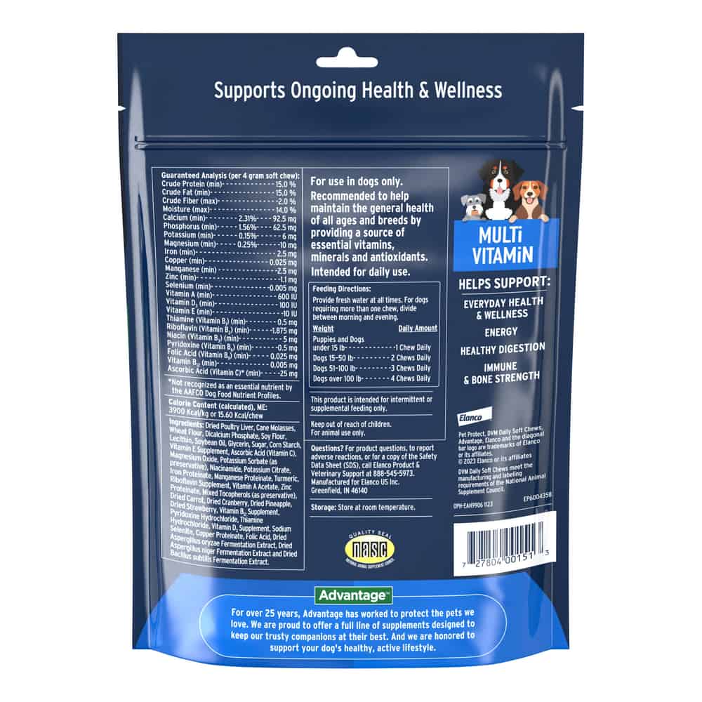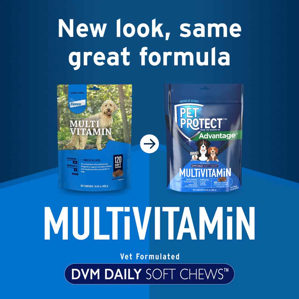 Pet Protect Vet-Formulated Daily Multivitamin DVM Soft Chews for Dogs is a tasty, antioxidant enriched multi-vitamin for dogs. It contains a nutritious blend of 22 vitamins, minerals, and dried fermentation extracts with added antioxidants. Pet Protect Vet-Formulated Daily Multivitamin DVM Soft Chews for Dogs helps support a healthy diet and lifestyle for dogs of all ages and breeds. It's available in a 120 ct bottle of soft chews.