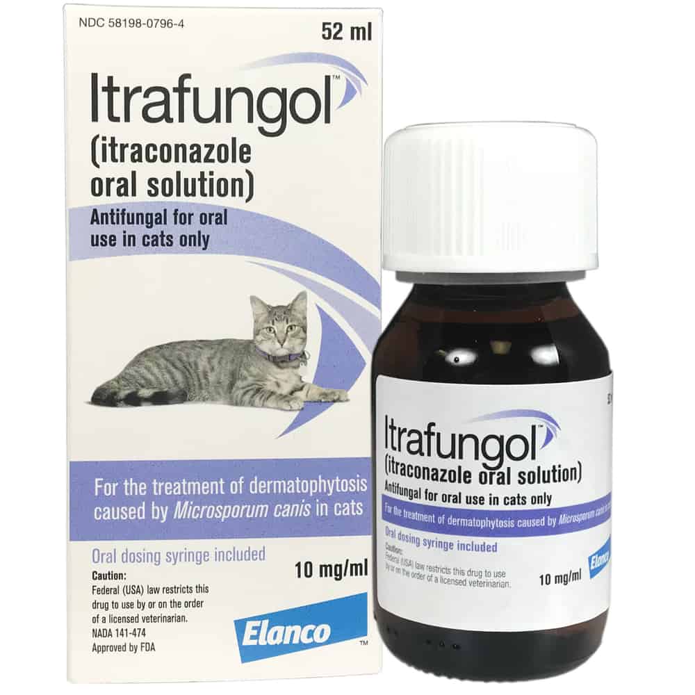 Itrafungol is for oral use in cats only and requires a prescription from your veterinarian. Itrafungol is an antifungal oral solution used to treat dermatophytosis, also known as ringworm. Itrafungol can be given with or without food. The solution is available in a 52 ml 10mg/ml bottle and comes with an oral dosing syringe. The solution should be administered orally using the enclosed graduated dosing syringe. Do not invert the bottle when filling the syringe.