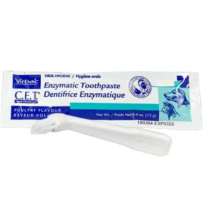 - Comes with trial packet of poultry flavored toothpaste