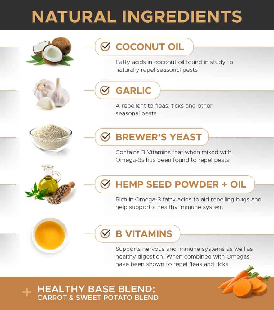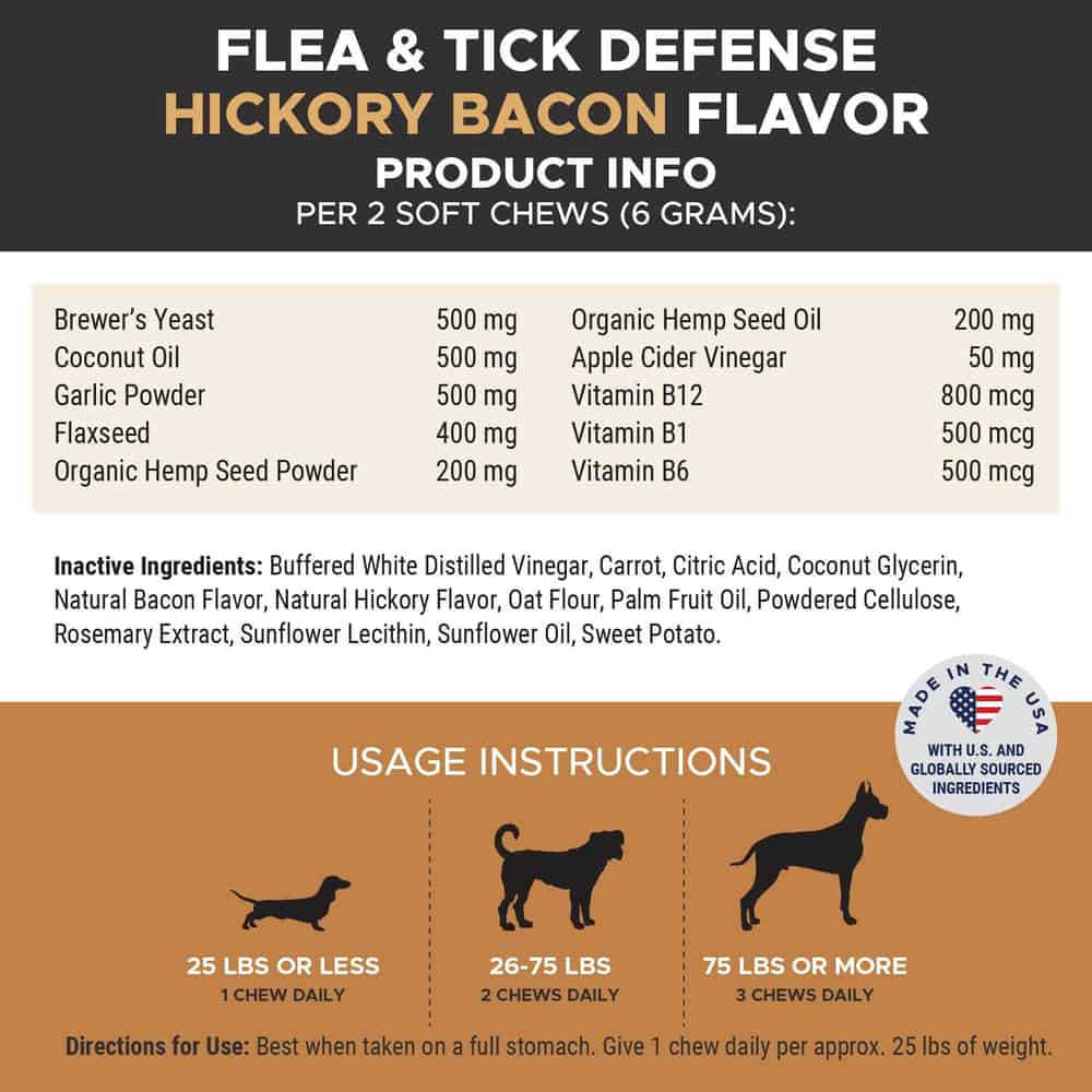 | Ingredients: Brewer's Yeast, Coconut Oil, Garglic Powder, Flaxseed, Organic Hemp Seed Powder, Organic Hemp Seed Oil, Appled Cider Vinegar, Vitamin B12, Vitamin B1, Vitamin B6, Buffered White Distilled Vinegar, Carrot, Citric Acid, Coconut Glycerin, Natural Bacon Flavor, Natural Hickory Flavor, Oat Flour, Palm Fruit Oil, Powdered Cellulose, Rosemary Extract, Sunflower Lecithin, Sunflower Oil, Sweet Potato | |
