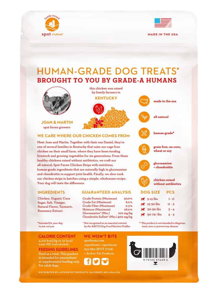 SPOT FARMS® All Natural Human Grade Dog Treats, Chicken Strips with Glucosamine and Chondroitin Directions: