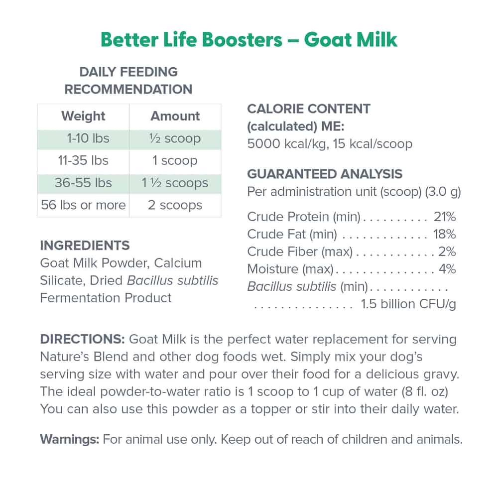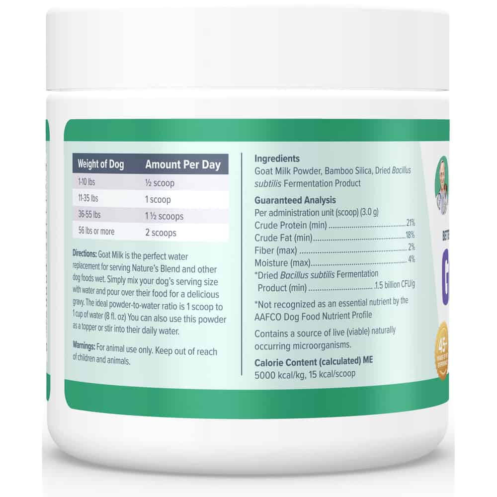 - Goat milk is the perfect water replacement for serving Nature's Blend and other dog foods wet.