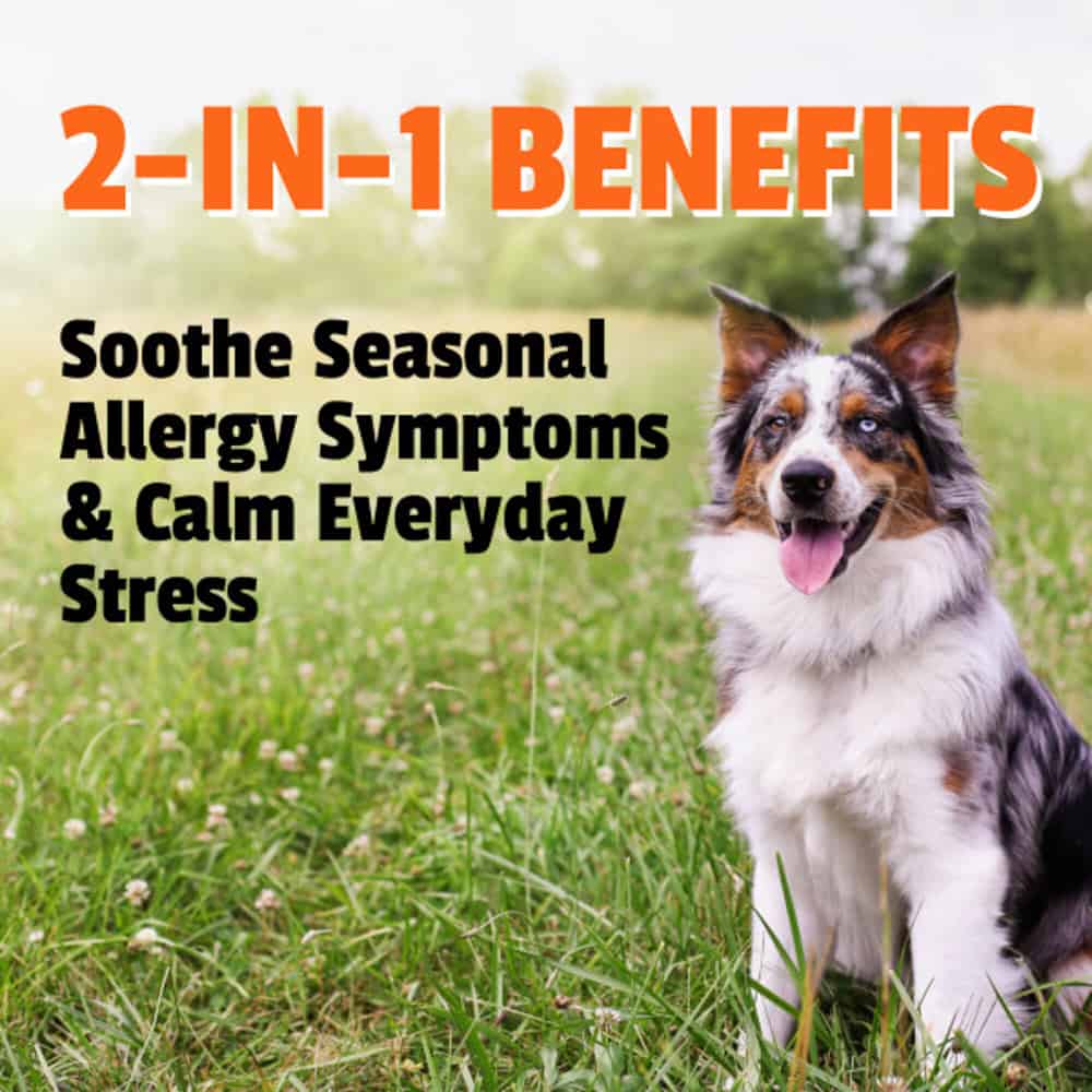 Seasonal allergies causing stress for your dog? Effective calming ingredients in Allergy + Calming soft chews promote a calm state and reduced stress levels, which can also support physical comfort & a healthy immune system.