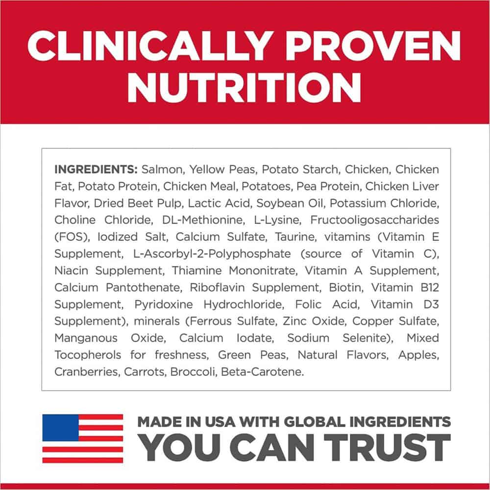 | Salmon, Yellow Peas, Potato Starch, Chicken, Chicken Fat, Potato Protein, Chicken Meal, Potatoes, Pea Protein, Chicken Liver Flavor, Dried Beet Pulp, Lactic Acid, Soybean Oil, Potassium Chloride, Choline Chloride, DL-Methionine, L-Lysine, Fructooligosaccharides (FOS), Iodized Salt, Calcium Sulfate, Taurine, vitamins (Vitamin E Supplement, L-Ascorbyl-2-Polyphosphate (source of Vitamin C), Niacin Supplement, Thiamine Mononitrate, Vitamin A Supplement, Calcium Pantothenate, Riboflavin Supplement, Biotin, Vitamin B12 Supplement, Pyridoxine Hydrochloride, Folic Acid, Vitamin D3 Supplement), minerals (Ferrous Sulfate, Zinc Oxide, Copper Sulfate, Manganous Oxide, Calcium Iodate, Sodium Selenite), Mixed Tocopherols for freshness, Green Peas, Natural Flavors, Apples, Cranberries, Carrots, Broccoli, Beta-Carotene. |