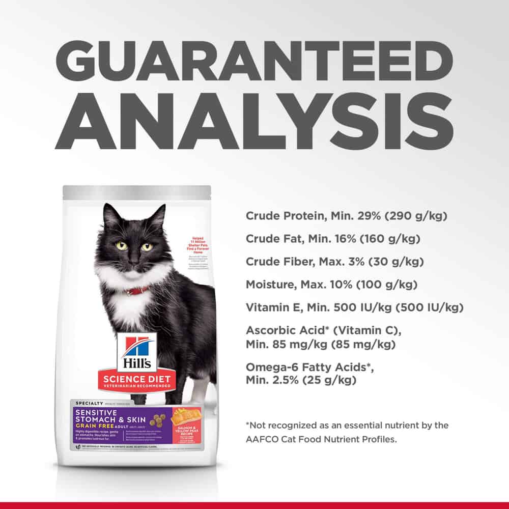 | Animal feeding tests using AAFCO procedures substantiate that Hill's Science Diet Adult Sensitive Stomach & Skin Grain Free cat food provides complete and balanced nutrition for maintenance of adult cats |