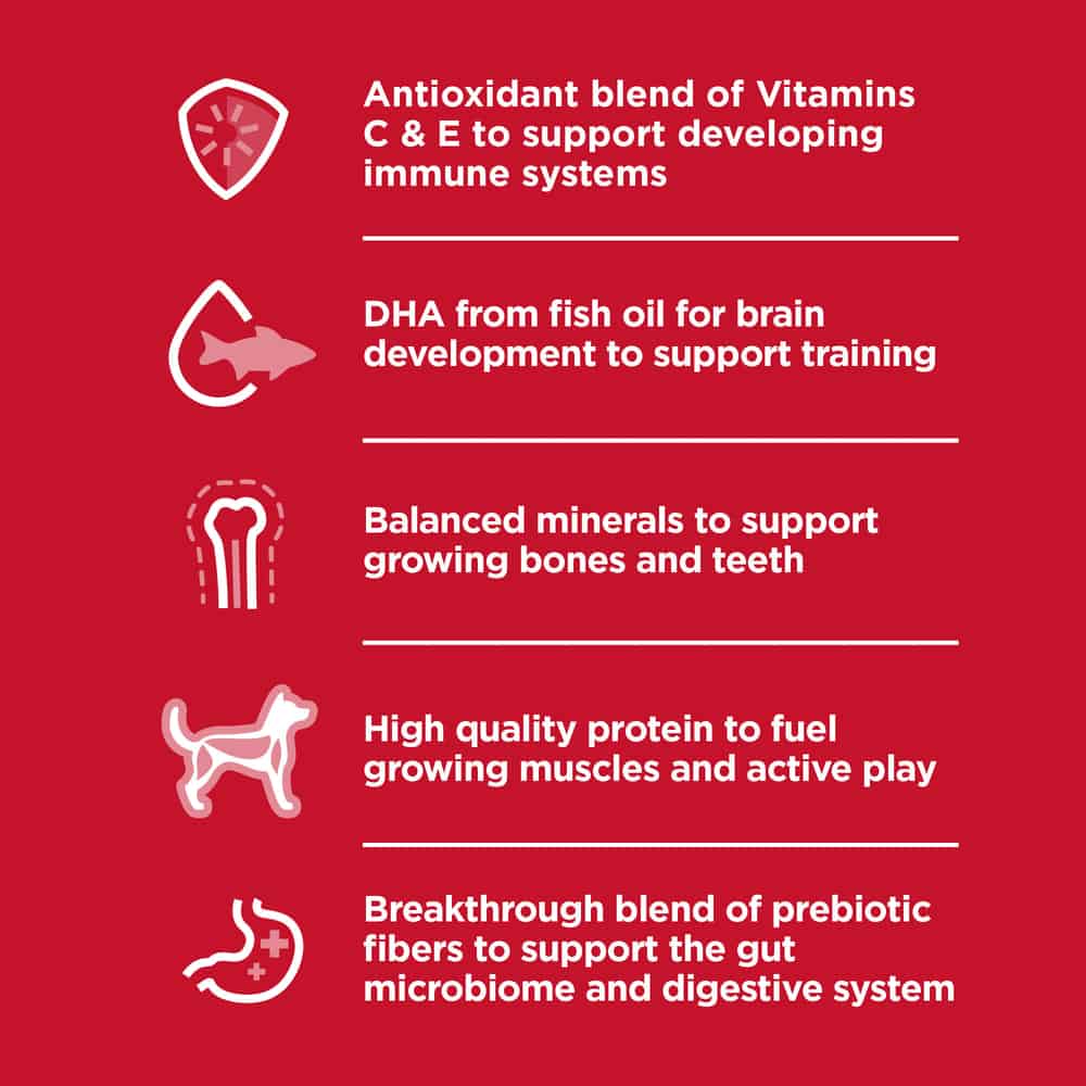 A specific formula for small-breed dogs, with an antioxidant blend for lifelong immune support. High-quality protein from real chicken works with prebiotic fibers to ensure easily digestible nutrition. It includes DHA from fish oil to support healthy brain and eye development, and balanced minerals for the crucial early stages of bone growth.