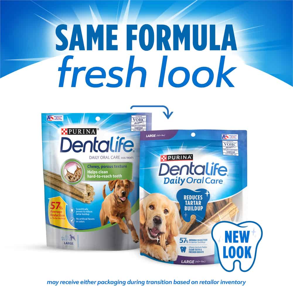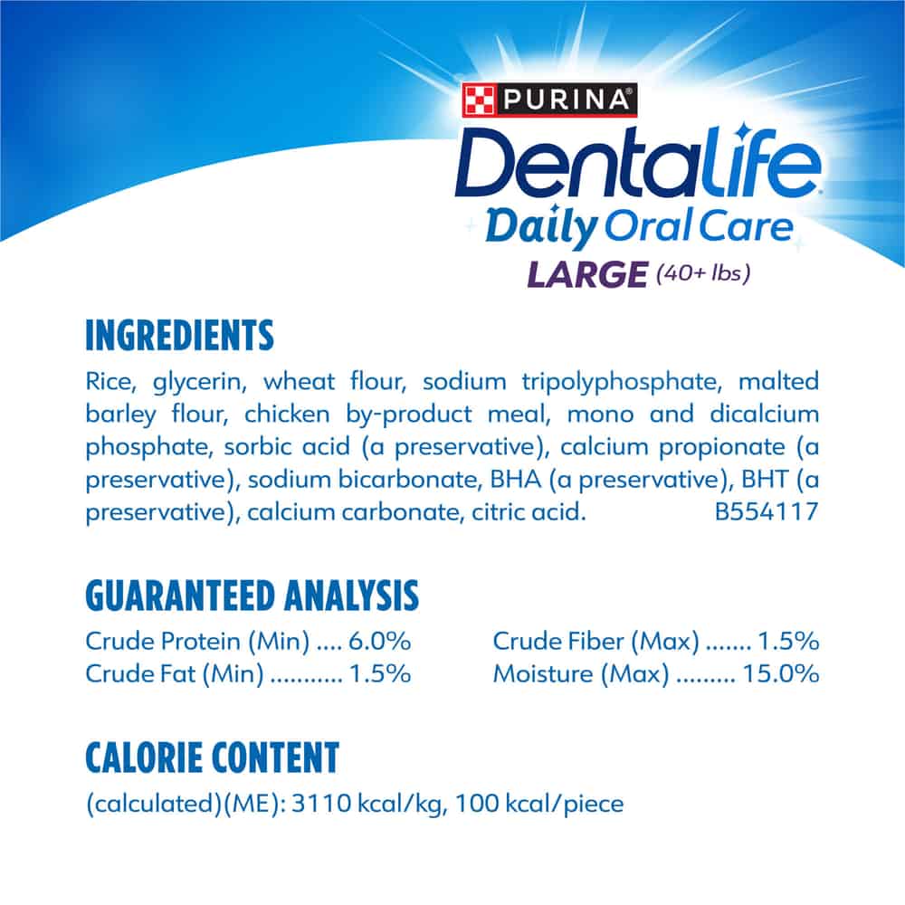 - Purina DentaLife Daily Oral Care dental chews for large dogs are satisfaction guaranteed (see packaging for details)