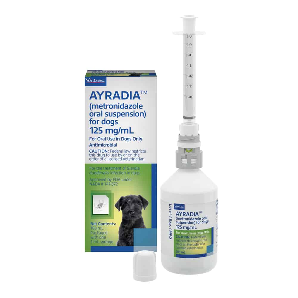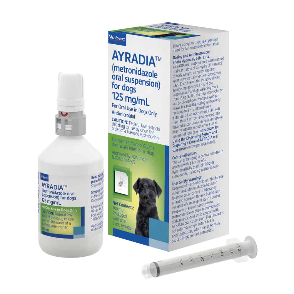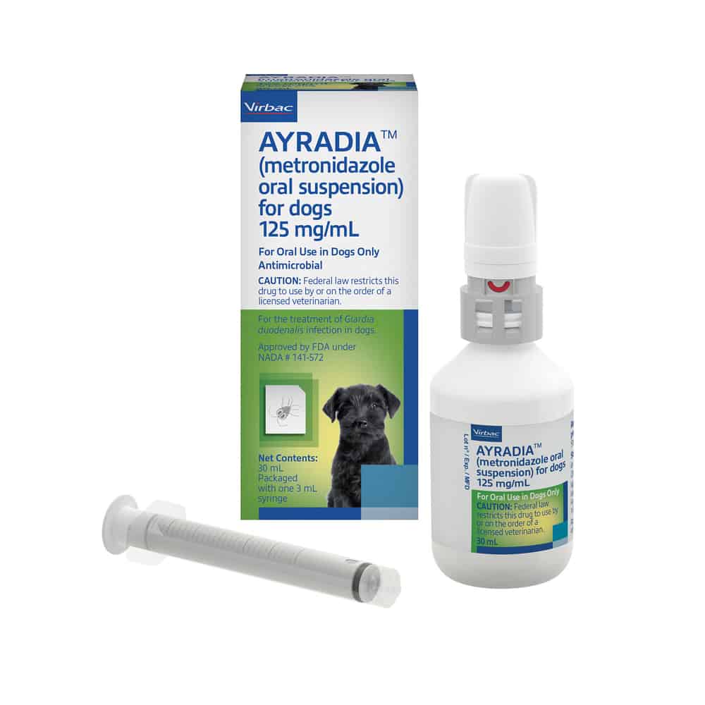 AYRADIA (metronidazole oral suspension) for dogs is an antibiotic, it is the first FDA-approved flavored oral metronidazole solution for dogs and puppies. AYRADIA oral suspension is for the treatment of Giardia duodenalis infection in dogs.
