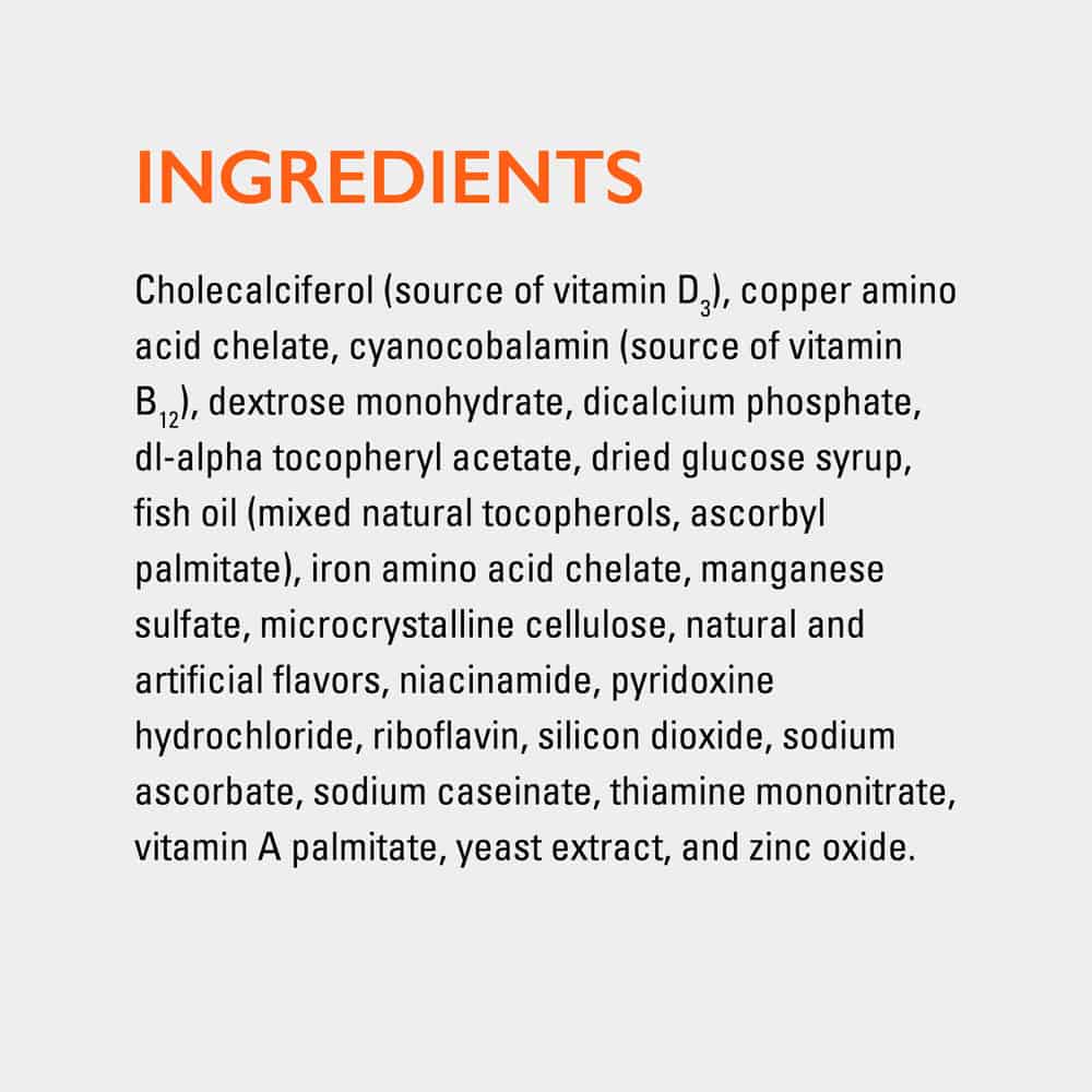 | Cholecalciferol (source of vitamin D3 ), copper amino acid chelate, cyanocobalamin (source of vitamin B12), dextrose monohydrate, dicalcium phosphate, dl-alpha tocopheryl acetate, dried glucose syrup, fish oil (mixed natural tocopherols, ascorbyl palmitate), iron amino acid chelate, manganese sulfate, microcrystalline cellulose, natural and artificial flavors, niacinamide, pyridoxine hydrochloride, riboflavin, silicon dioxide, sodium ascorbate, sodium caseinate, thiamine mononitrate, vitamin A palmitate, yeast extract, and zinc oxide |