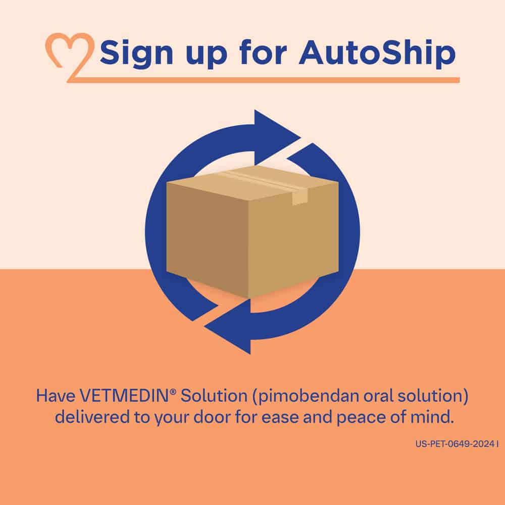 The most common side effects are poor appetite, lethargy, diarrhea, shortness of breath, weakness, and ataxia (lack of muscle control and coordination). If side effects occur, consult your veterinarian. The safety of VETMEDIN® Solution (pimobendan oral solution) inodilator has not been established in puppies younger than 6 months of age, or in breeding, pregnant or lactating dogs. For more information, please see full prescribing information.