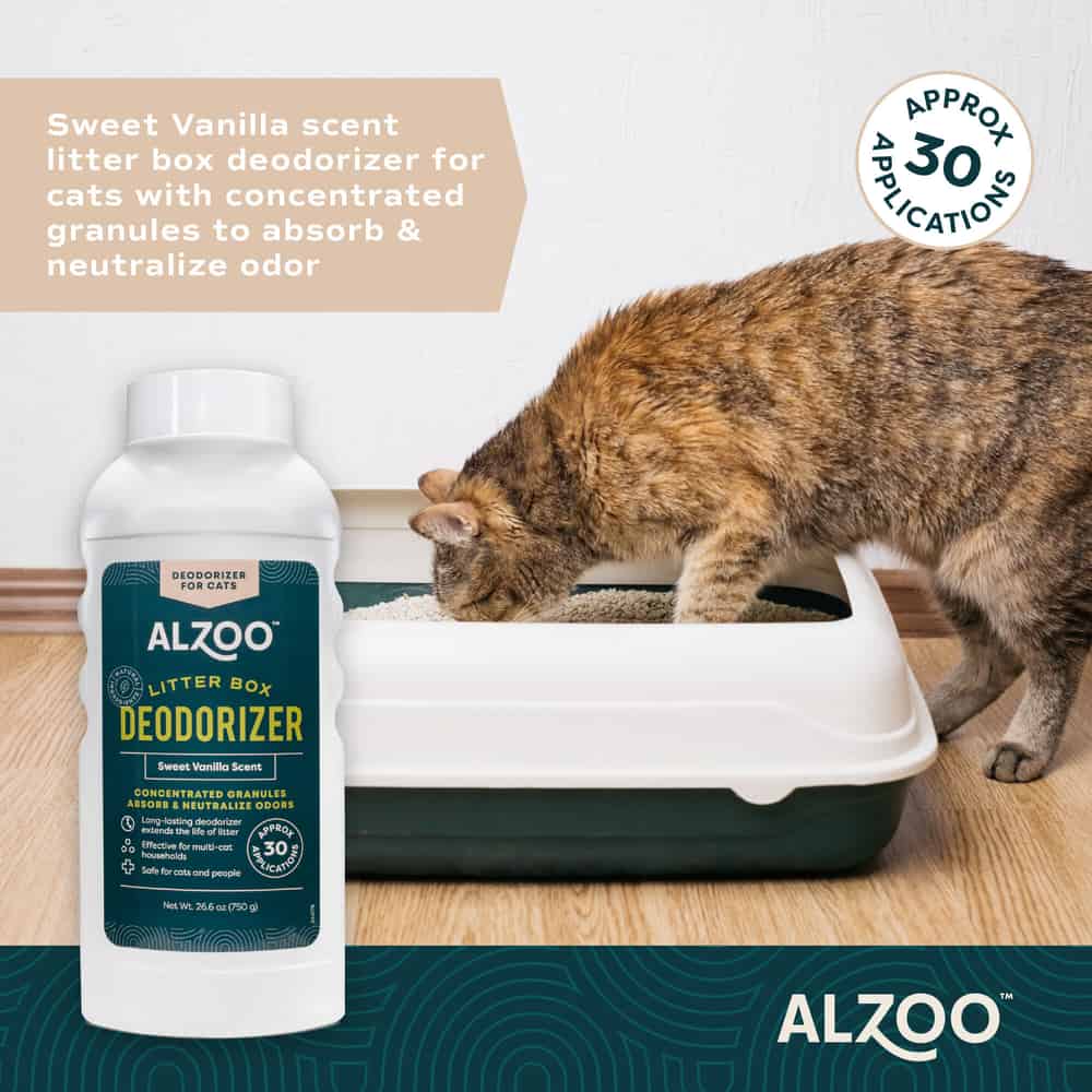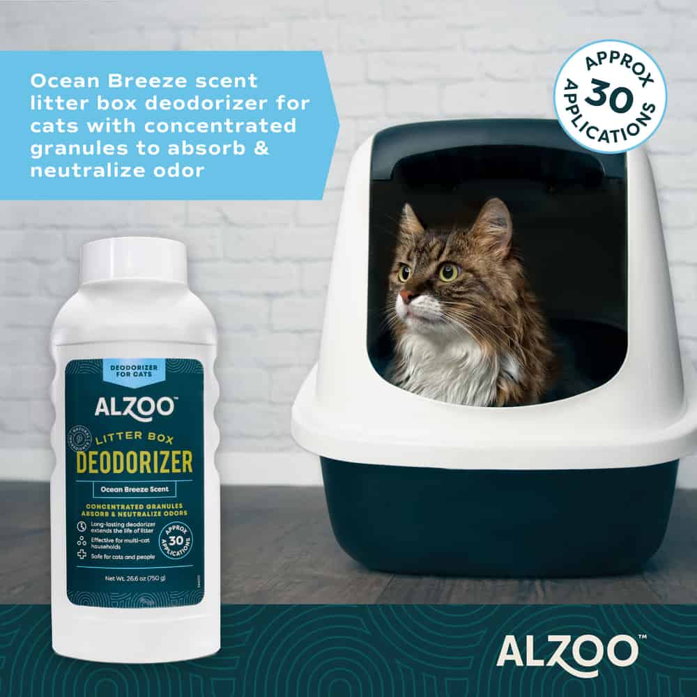 For a quick litter box refresh between full changes, sprinkle a light layer of Alzoo Deodorizer to neutralize odors and extend the life of your litter.