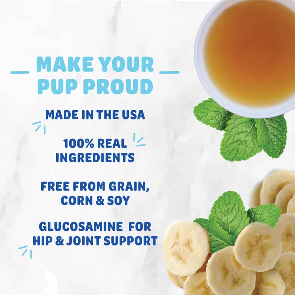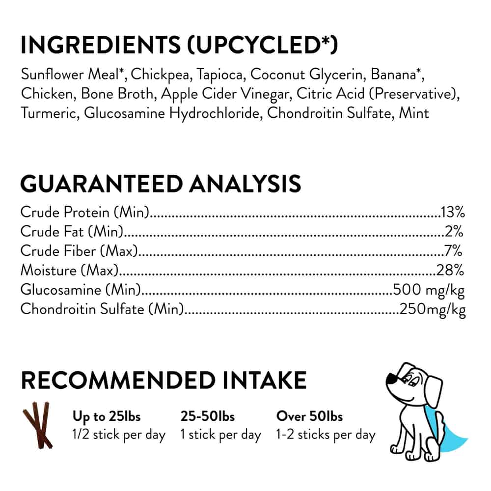 | Sunflower meal*, chickpea, tapioca, coconut glycerin, banana*, chicken bone broth, apple cider vinegar, citric acid (a preservative), turmeric, glucosomine hydrochloride, chondroitin sulfate, mint |