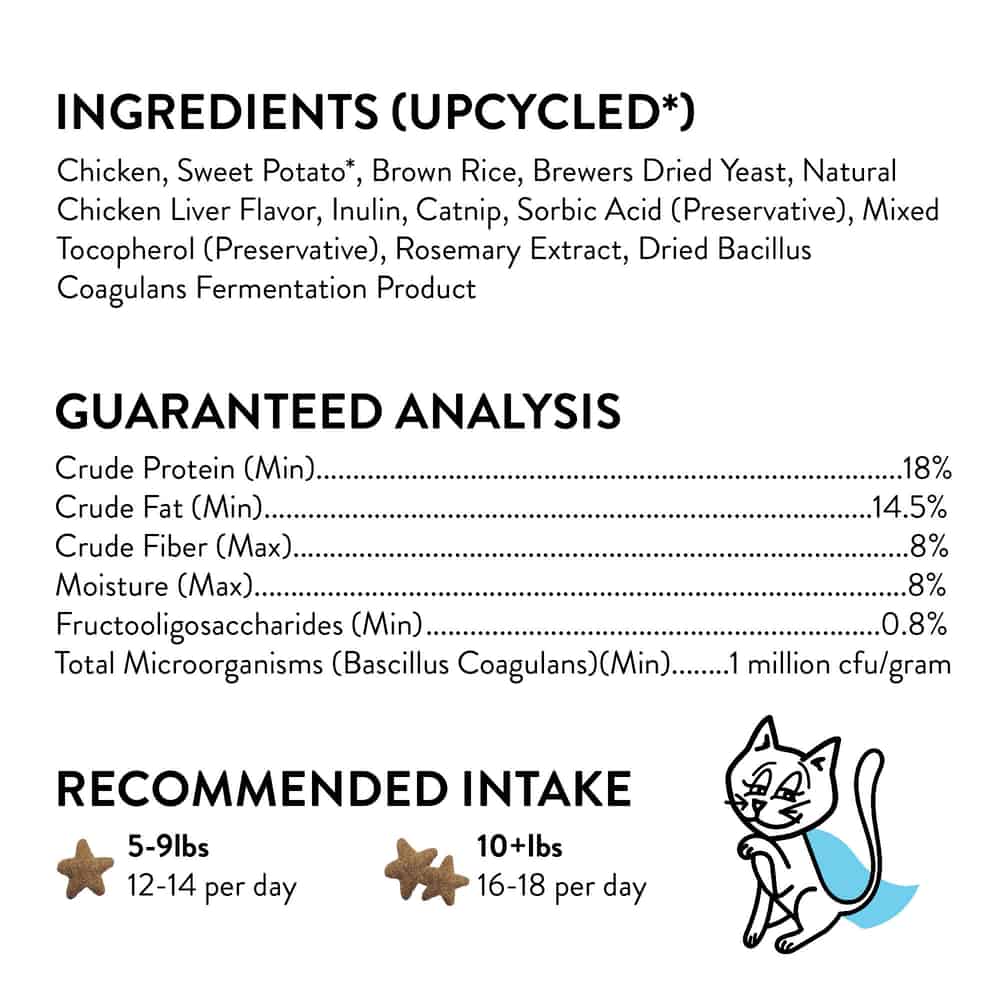 | Chicken, Sweet Potato*, Brown Rice, Tapioca, Brewers Dried Yeast, Miscanthus Grass, Chicken Fat, Natural Chicken Liver Flavor, Catnip, Inulin, Sorbic Acid (A Preservative), Mixed Tocopherols (A Preservative), Rosemary Extract, Dried Bacillus Coagulans Fermentation Product |