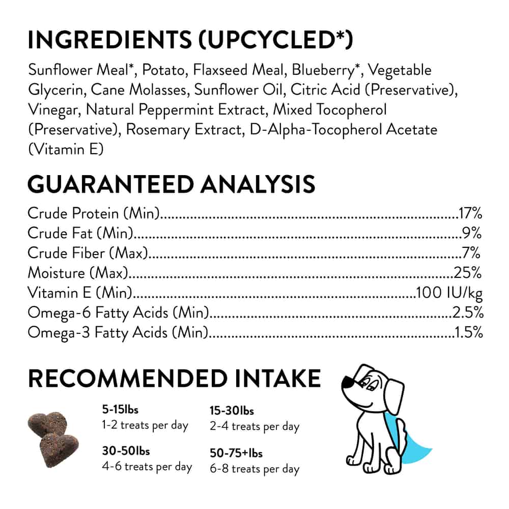 | Sunflower meal*, potato, flaxseed meal, blueberry*, vegetable glycerin, cane molasses, sunflower oil, citric acid (a preservative), vinegar, natural peppermint extract, mixed tocopherols (a preservative), rosemary extract, d-alpha-tocopherol acetate (Vitamin E) |