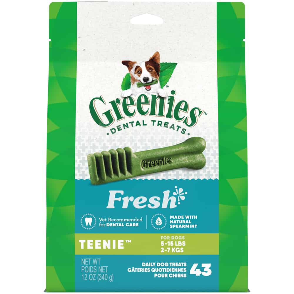 One Greenies Fresh Dental Treat is all it takes for clean teeth, fresh breath, and a happy dog. Your dog can't wait to sink their teeth into these delicious dental dog breath chews because they are bursting with breath-freshening mint flavor and feature a delightfully chewy texture that fights plaque and tartar.