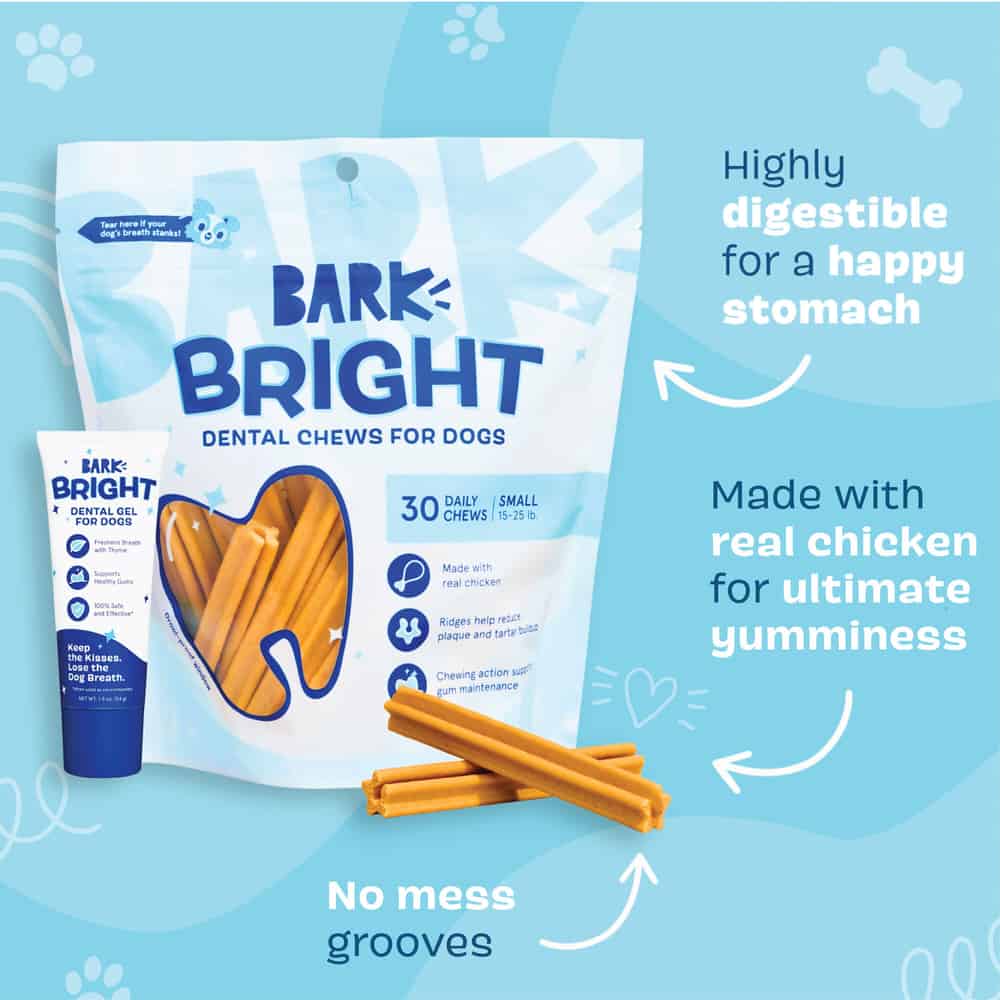 Say goodbye to doggy breath and hello to a brighter smile with BARK Bright Chicken Flavored Dental Dog Treats & BARK Bright Chicken & Thyme Flavored Dog Dental Gel. This comprehensive dental care solution offers an easy and effective way to maintain your dog’s oral health. Like a toothbrush, Bark Bright dental chew sticks feature strategically placed scrubbing ridges to help combat plaque and tartar buildup. Each stick works to massage your dog’s gums and reach into every crevice for a fresh and thorough clean. Plus, the toothpaste features an irresistible chicken and thyme flavor that keeps your canine coming back for more.