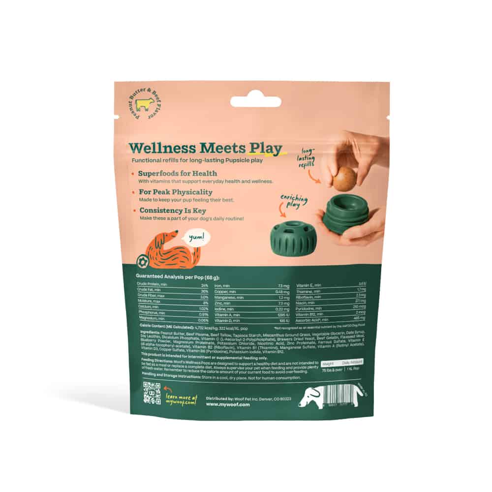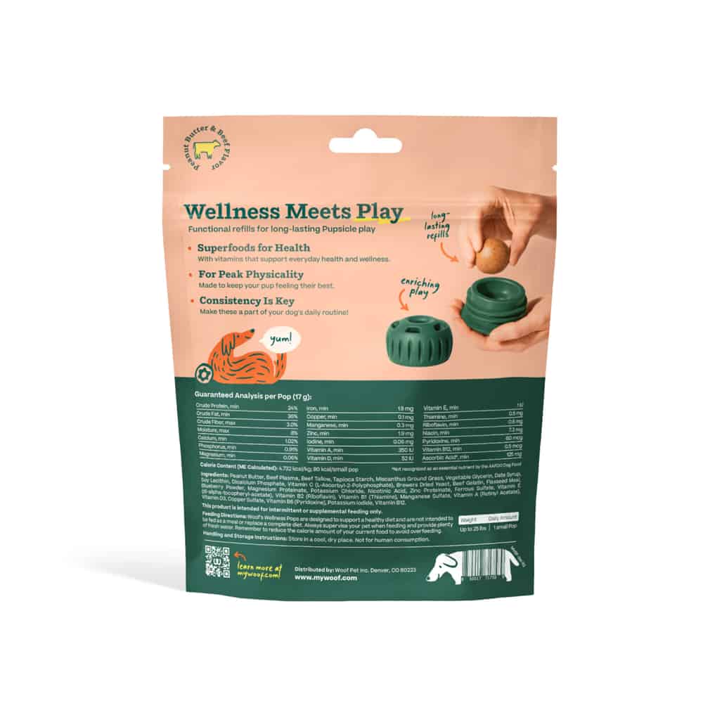 Woof All-In-1 Wellness Pops are treat refills for the Pupsicle that provide essential nutrients to support overall health, including joint, brain, and body function, during engaging play.