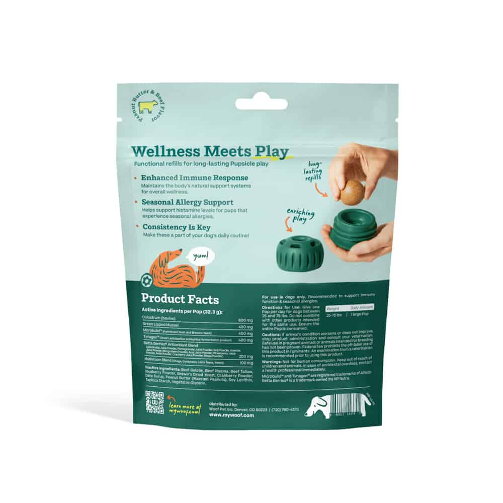Woof Allergy Support Wellness Pops are designed to be used with the Pupsicle and contain ingredients such as an antioxidant berry blend and green-lipped mussel to help ease allergy discomfort and support the immune system.