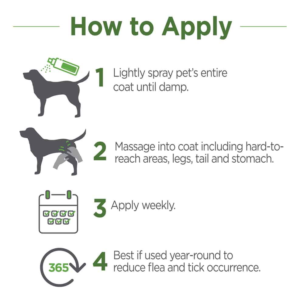 - PETS: Rub coat in opposite direction & spray lightly (not soak) the body, belly, legs & tail. Do not spray in eyes, face or genitals. Test spray in small area. If pet is sensitive to product, bathe in mild, grease-cutting detergent & water to remove product. For dogs & cats 12 weeks of age or older. Apply once a week until infestation is eliminated. Then continue using as a repellant applying every two weeks.