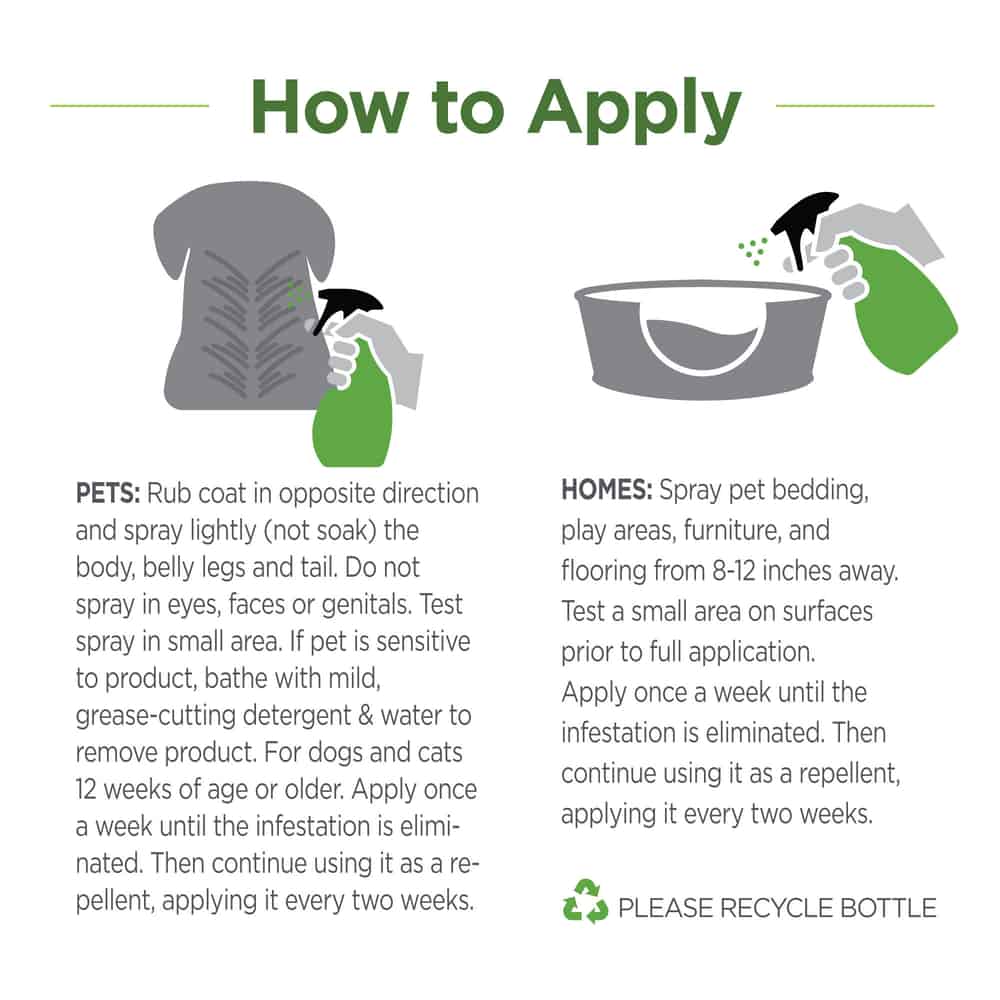 - HOMES: Spray pet bedding, play areas, furniture & flooring from 8-12 inches away. Test a small area on surfaces prior to full application. Apply once a week until infestation is eliminated. Then continue using as a repellant applying every two weeks.