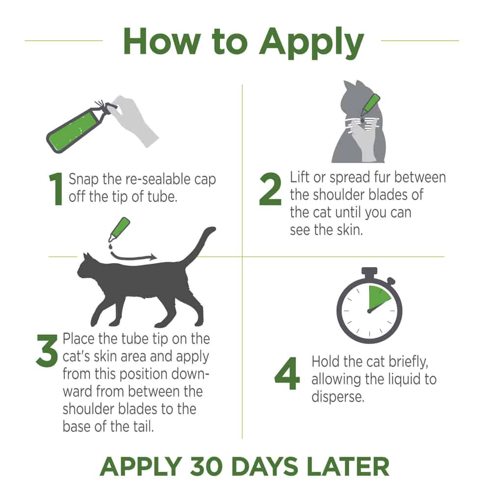 - For Cats 12 weeks of age or older. Apply once per month for continuous protection or more frequently as needed, but not more often than once every 2 weeks. Avoid bathing or swimming for 24 hours after application.