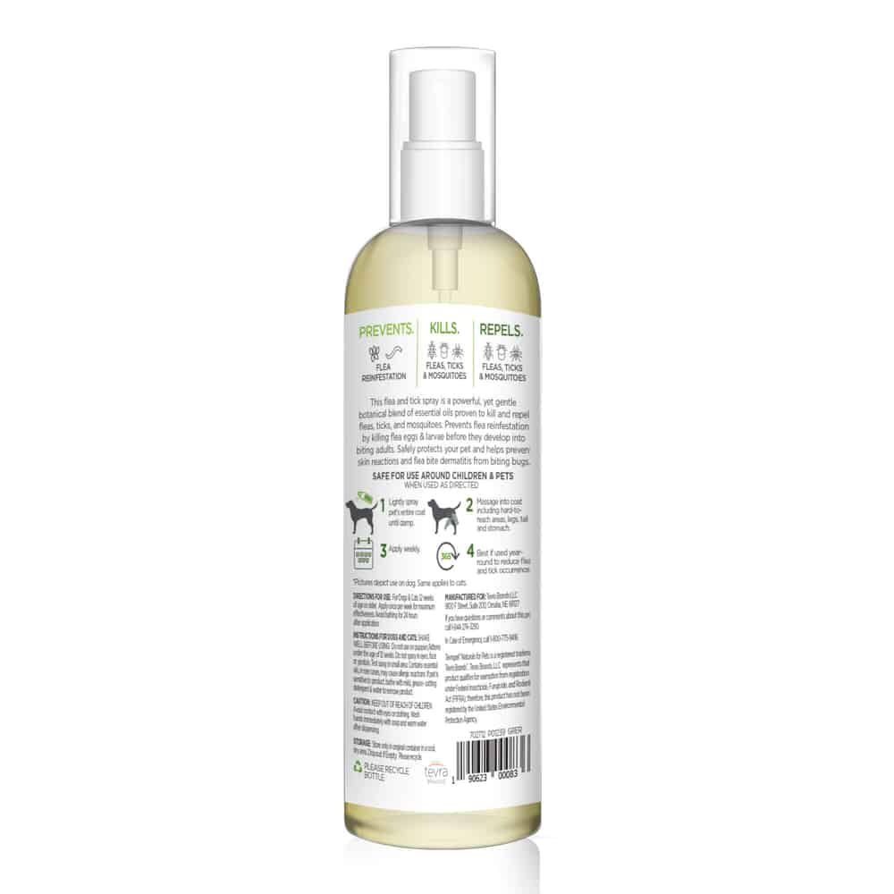 Tevrapet® Naturals Flea & Tick Spray for Pets is a powerful, yet gentle botanical blend of essential oils proven to kill and repel fleas, ticks & mosquitoes. Prevents flea reinfestation by killing flea eggs & larvae before they develop into biting adults. Safely protects your pet and helps prevent skin reactions and flea bite dermatitis from biting bugs. Paraben Free. For Dogs & Cats over 12 weeks of age. Safe for use around children and pets, when used as directed.