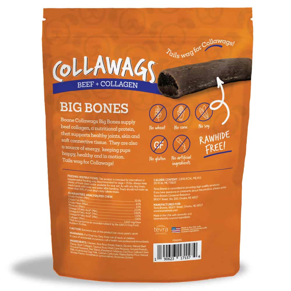 Collawags Large Bones are made with natural delicious ingredients fortified with beef collagen. Collawags help support healthy immune response, healthy bones, skin, tendons, joints and ligaments. Dogs will crave this beef flavor.