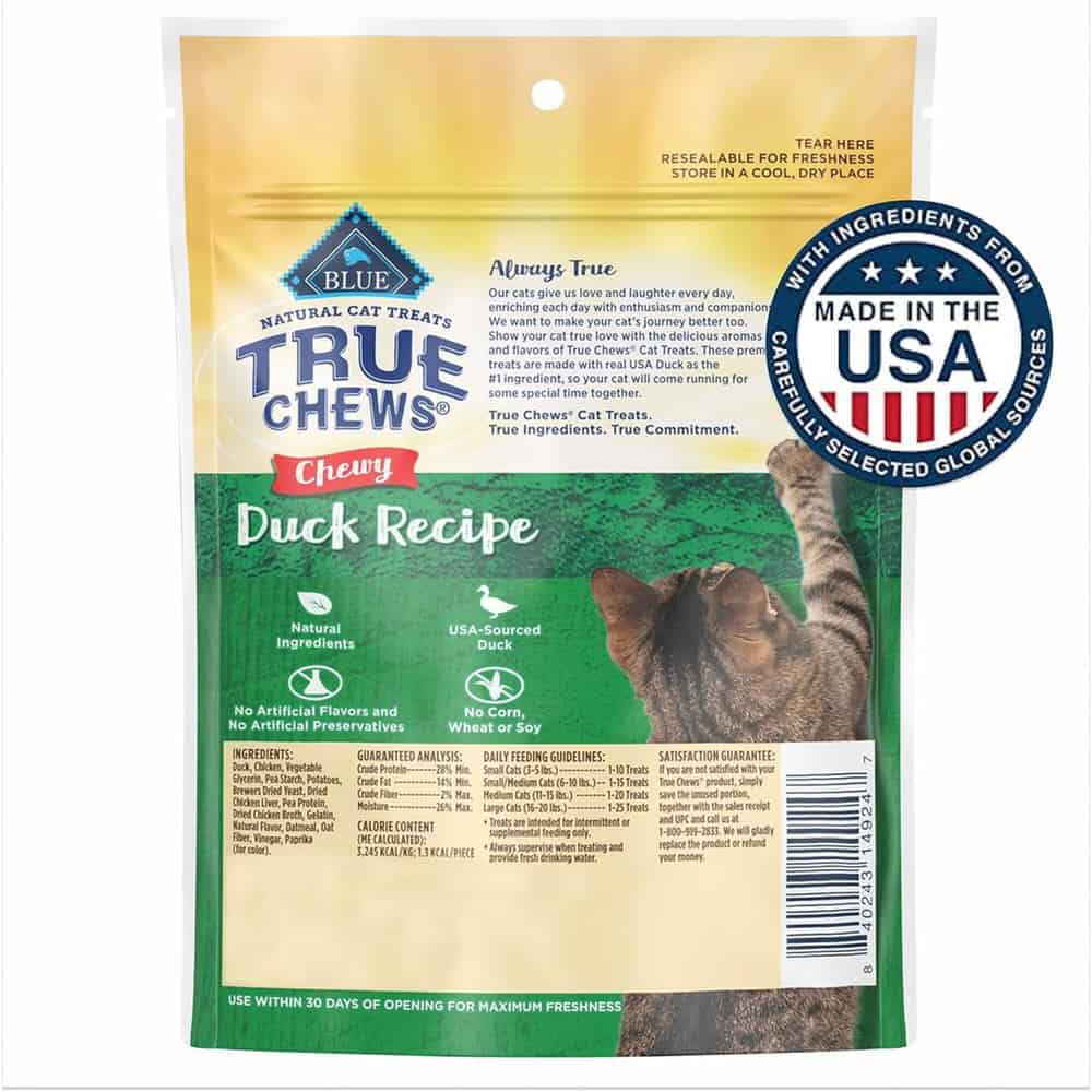 - REAL DUCK FIRST: BLUE True Chews Chewy Cat Treats are made with real duck as the first ingredient for a tasty flavor your cat will savor