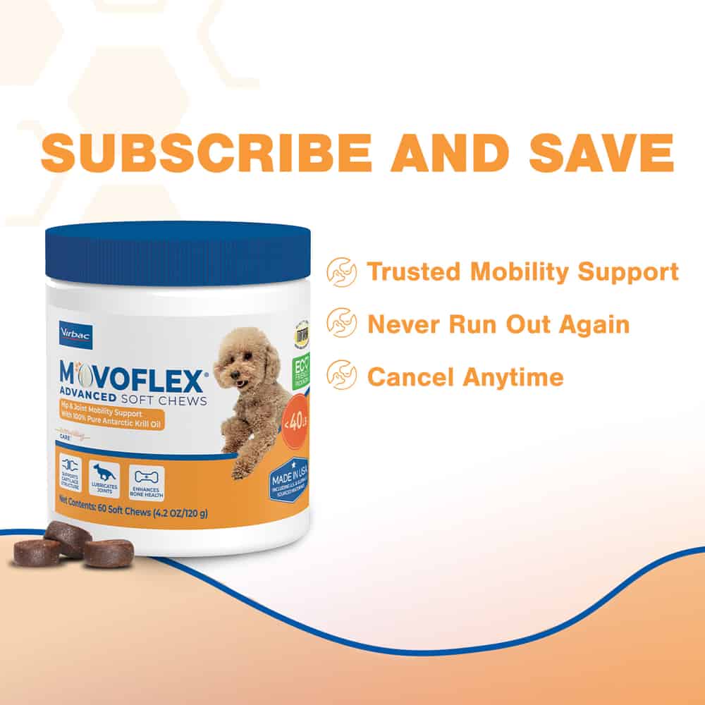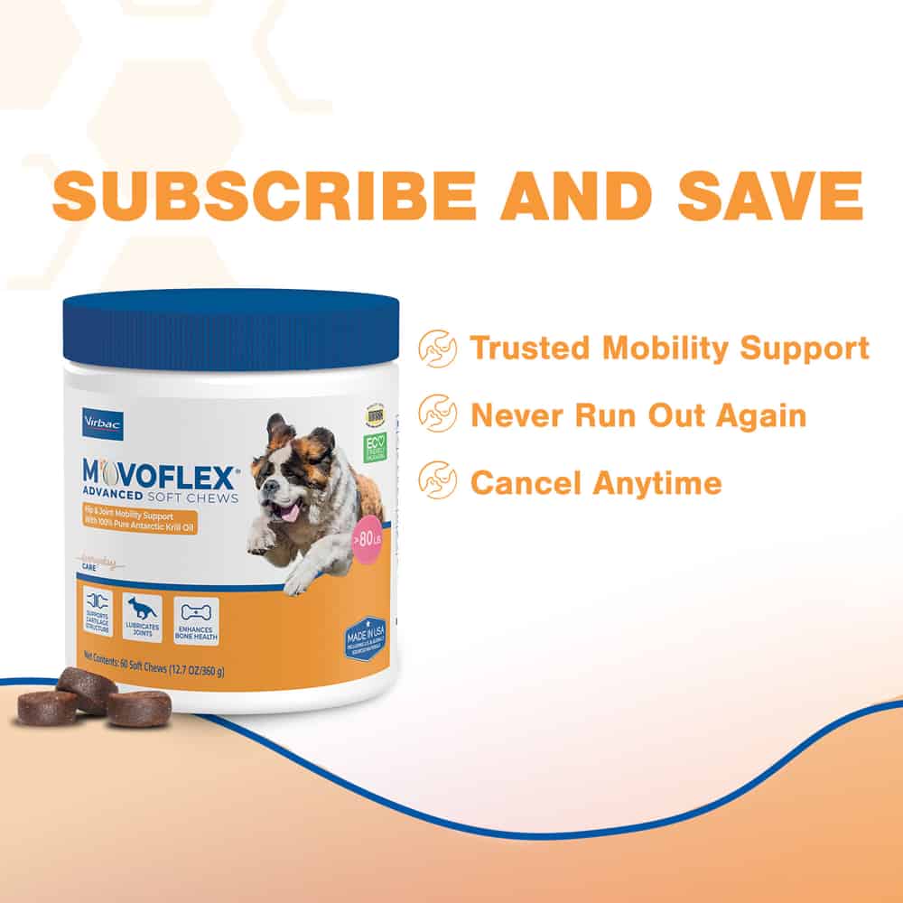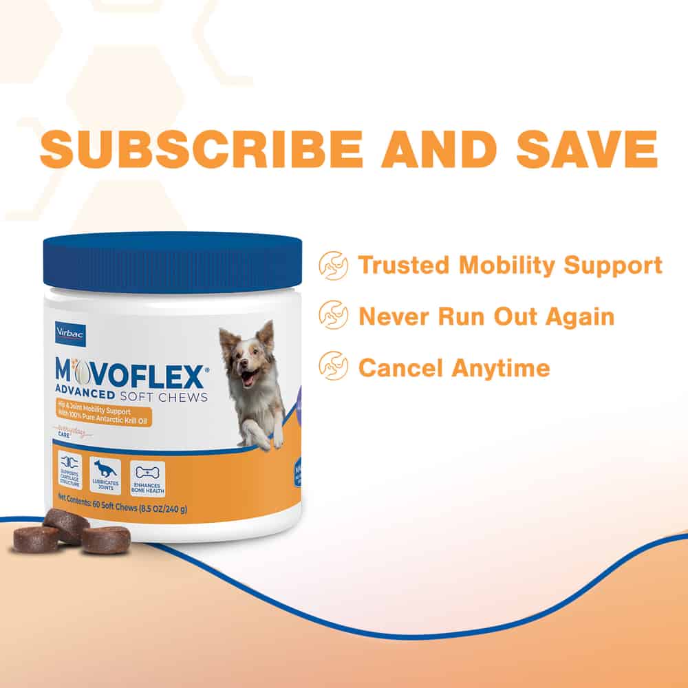 Support your pup’s mobility with Virbac MOVOFLEX Advanced Soft Chews Joint Supplement for Medium Breed Dogs. This supplement is formulated to support healthy bones and joint flexibility in medium-sized dogs weighing 40–80 pounds. The advanced formula includes the foundational ingredients of MOVOFLEX Soft Chews (sold separately)—including BIOVAFLEX eggshell membrane—plus two new ingredients for additional benefits. Krill oil with omega-3 fatty acids help lubricate joints, while low molecular weight hyaluronic acid works with krill oil and astaxanthin to provide optimal joint support. Plus, all this goodness comes in a soft chew that’s easy to administer.