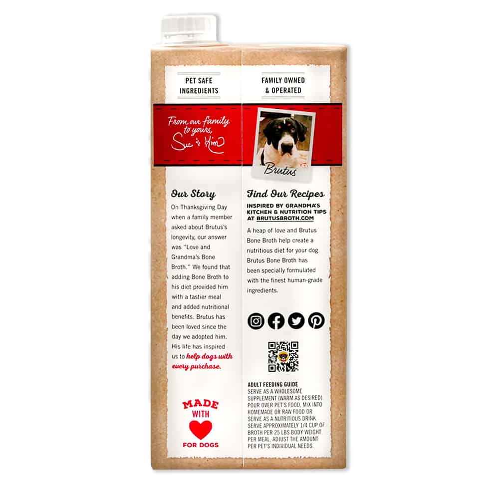 Looking for the ultimate pet superfood that enhances a pet's overall health? Look no further! Brutus Bone Broth (Chicken) easily elevates the flavor and nutrition of a dog’s meal with its delicious all-natural, human-grade bone broth food topper, which will make even the pickiest eaters beg for more. The savory Chicken Bone Broth is fortified with veterinarian-recommended servings of supplemental glucosamine and chondroitin for hip and joint health, and turmeric, a powerhouse superfood. Because bone broth for humans is not safe for pets (due to toxic ingredients and high sodium), Brutus spent years developing their nourishing superfood formula so that pet owners can feel great about feeding their pets something they love. The amino acids, nutrients, and naturally occurring collagen found in bone broth can help to improve digestion and and chronic digestive disorders, promote healthy skin, hair, teeth, and nails, support mobility, and can help boost energy levels. Brutus Broth can also help pets recovering from injury, illness, or facing mobility issues. It eases chewing for puppies and senior dogs, and entices pets with picky palates or lack of appetite to eat.