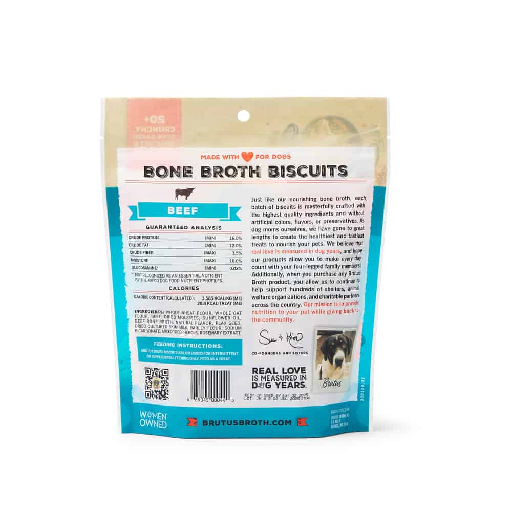 Crafted with real meat and Brutus' functional beef bone broth, these biscuits deliver on flavor, crunch, and nutrition! With glucosamine and chondroitin for joint health and high in protein, their 100% natural biscuits are the perfect treat for dogs of all sizes. Crunchy treats are a great way to reward positive behaviors during training, reduce anxiety, and enhance the bond between pets and their people. Brutus Bone Broth Biscuits offer exceptional nutrition, clean ingredients, and functional benefits to enhance the lives of pets!