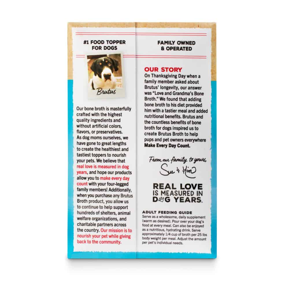 Brutus' Hip and Joint functional Beef Bone Broth is perfectly sized to encourage protein rotation and trial. In addition to providing pets with collagen, essential amino acids, and added hydration, their Beef Bone Broth is fortified with veterinarian-recommended servings of supplemental glucosamine and chondroitin for hip and joint health, and turmeric, a powerhouse superfood. Because bone broth for humans is not safe for pets (due to toxic ingredients and high sodium), Brutus spent years developing their nourishing superfood formula so that pet owners can feel great about feeding their pets something they love. The protein, nutrients, and naturally occurring collagen found in bone broth can help to improve nutrient absorption and chronic digestive disorders, promote healthy skin, hair, teeth, and nails, support mobility, and can help boost energy levels. Brutus Broth can also help pets recovering from injury, illness, or facing mobility issues, eases chewing for puppies and senior dogs, and entices pets with picky palates or lack of appetite to eat.