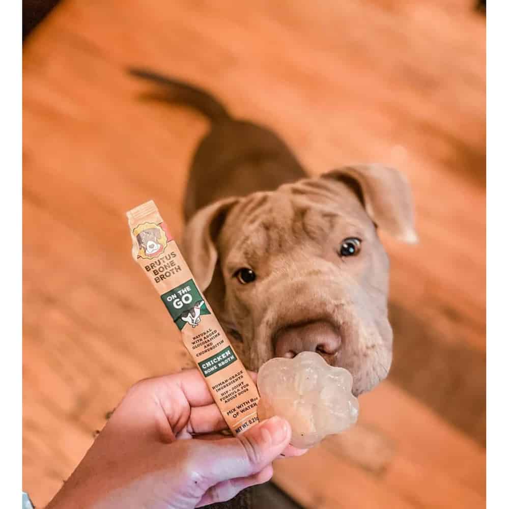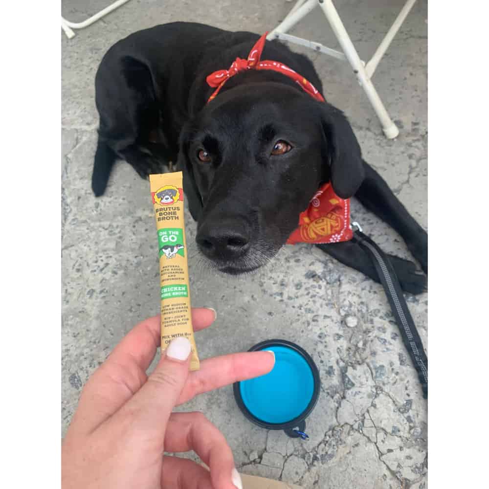 Traveling? Hiking? Out on the town? No worries – pet owners can take Brutus Broth and its countless benefits with them and their pet wherever their adventures might take them! Brutus on the Go is a convenient travel-sized, powdered version of the original human-grade Brutus Bone Broth. Brutus on the Go Chicken Bone Broth is fortified with veterinarian-recommended servings of supplemental glucosamine and chondroitin for hip and joint health, and turmeric, a powerhouse superfood. Because bone broth for humans is not safe for pets (due to toxic ingredients and high sodium), Brutus spent years developing their nourishing superfood formula that pet owners can feel great about and that their pets will love. The amino acids, nutrients, and naturally-occurring collagen found in bone broth can help to improve digestion and chronic digestive disorders, promote healthy skin, hair, teeth, and nails, support mobility, and can help boost energy levels. Bone broth is great for pups on the go because it is an effective source of hydration after active days and can encourage proper eating among dogs who might be experiencing travel-related anxiety.