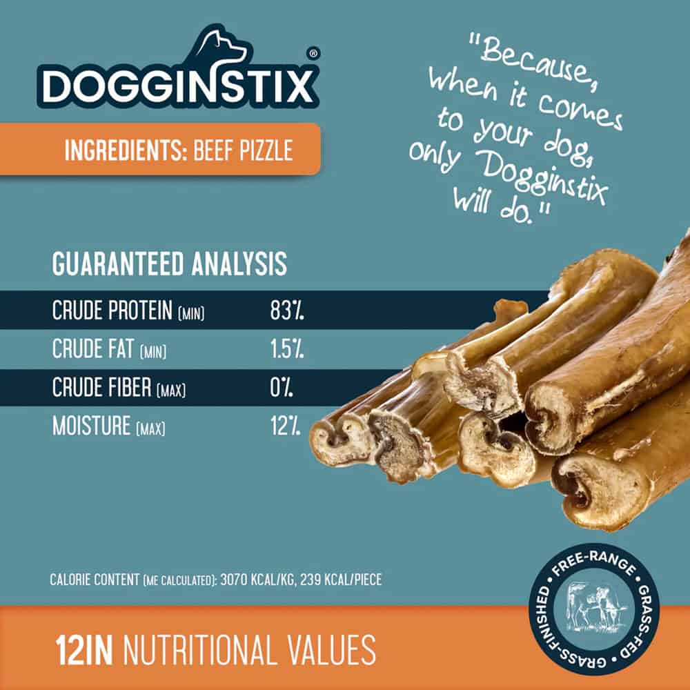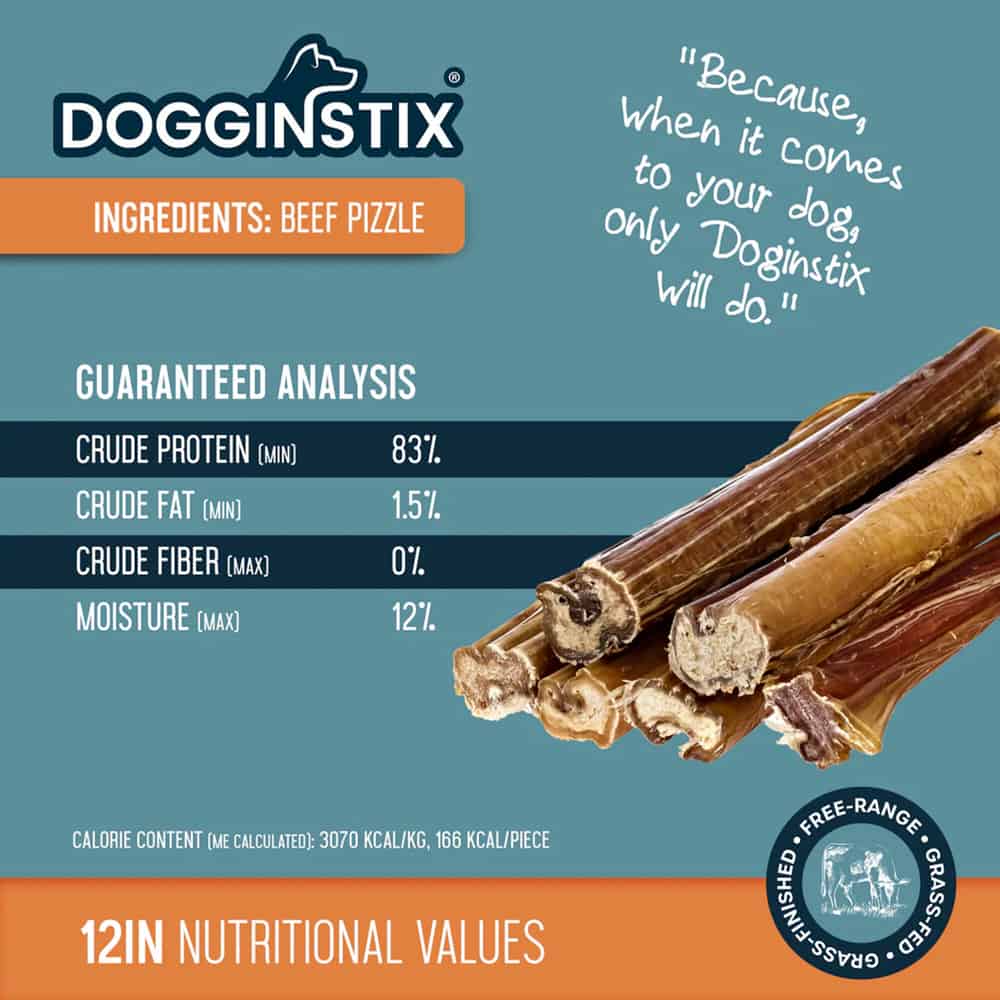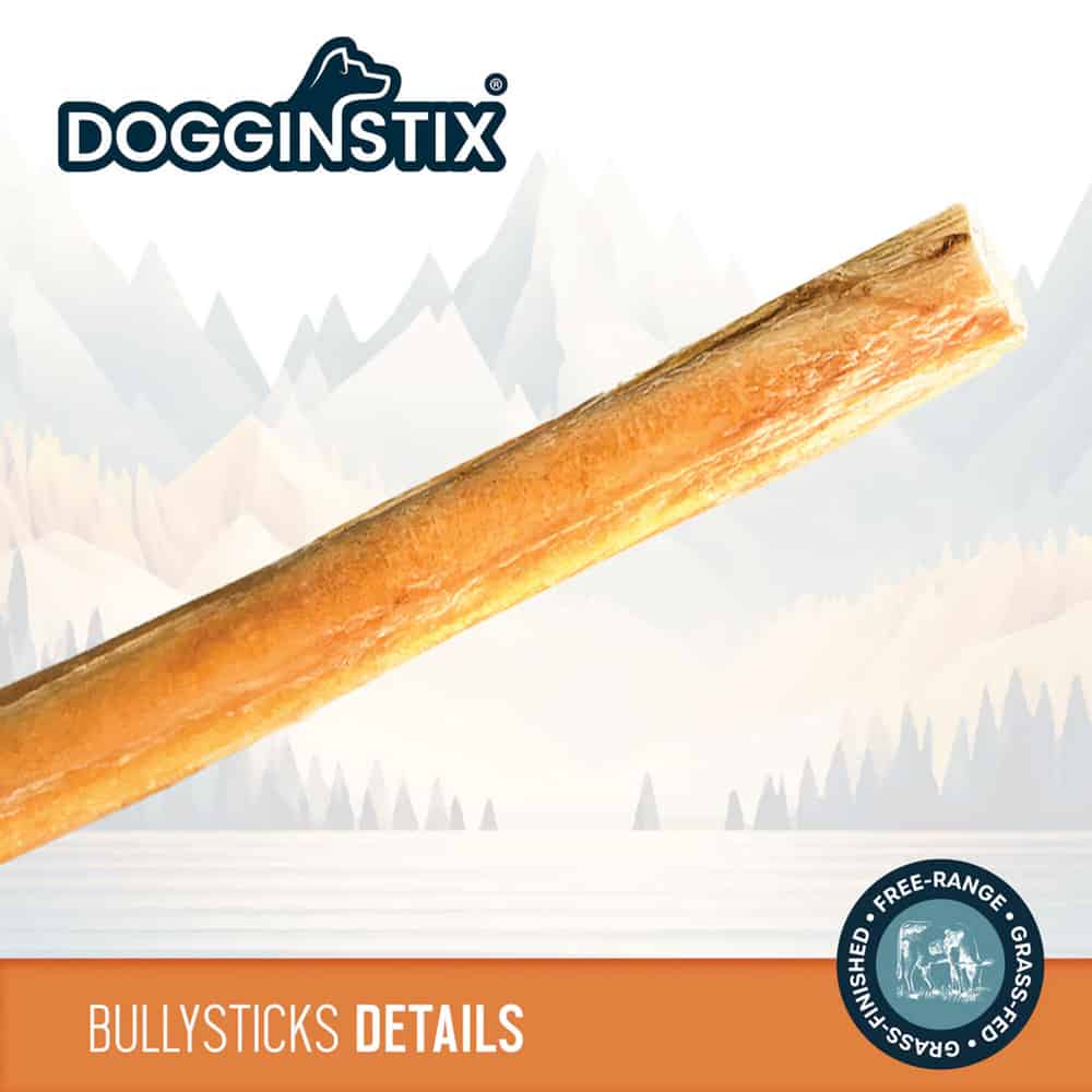 Dogginstix Grass-Fed Natural Bully Sticks are single-ingredient, long-lasting dog chews made from 100% grass-fed beef pizzle, providing a natural and digestible way to satisfy your dog's urge to chew.