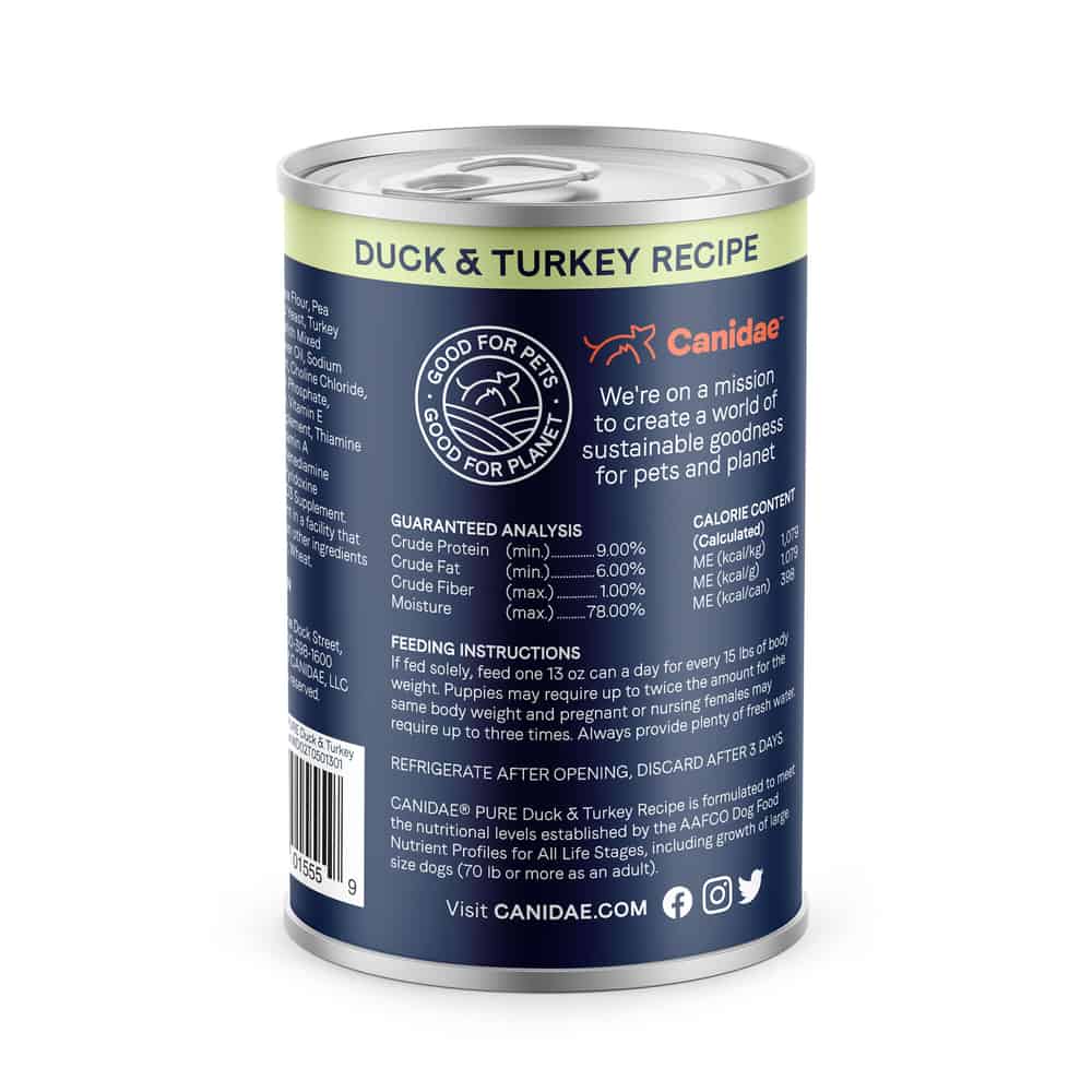 | CANIDAE PURE Wet Dog Food: Grain Free Duck and Turkey Recipe is formulated to meet the nutritional levels established by the AAFCO Dog Food Nutrient Profiles for maintenance. |