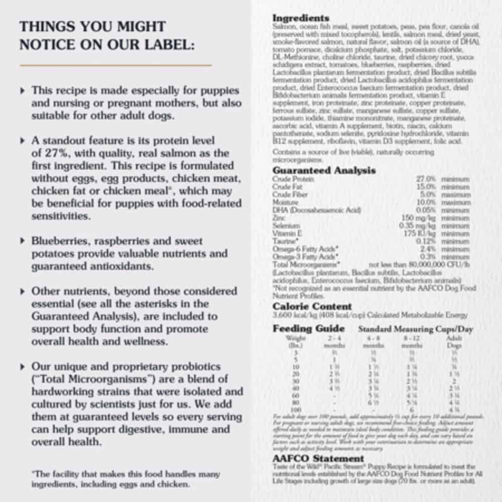 | Taste of the Wild Pacific Stream Puppy Recipe is formulated to meet the nutritional levels established by the AAFCO Dog Food Nutrient Profiles for All Life Stages including growth of large size dogs (70 lbs. or more as an adult). |