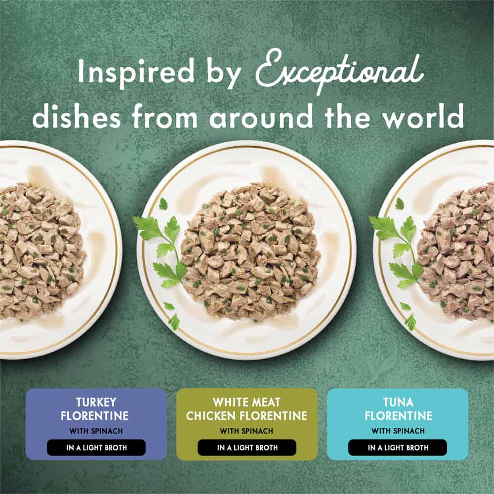 Purina's Fancy Feast Medleys Florentine Wet Canned Cat Food Variety Pack is crafted in partnership with their expert chefs and cat nutritionists. Each Purina wet cat food recipe features exceptional combinations inspired by dishes from around the world. Every serving of these Florentine adult cat food formulas features a thoughtful blend with real chicken, turkey or tuna in a delicate sauce.