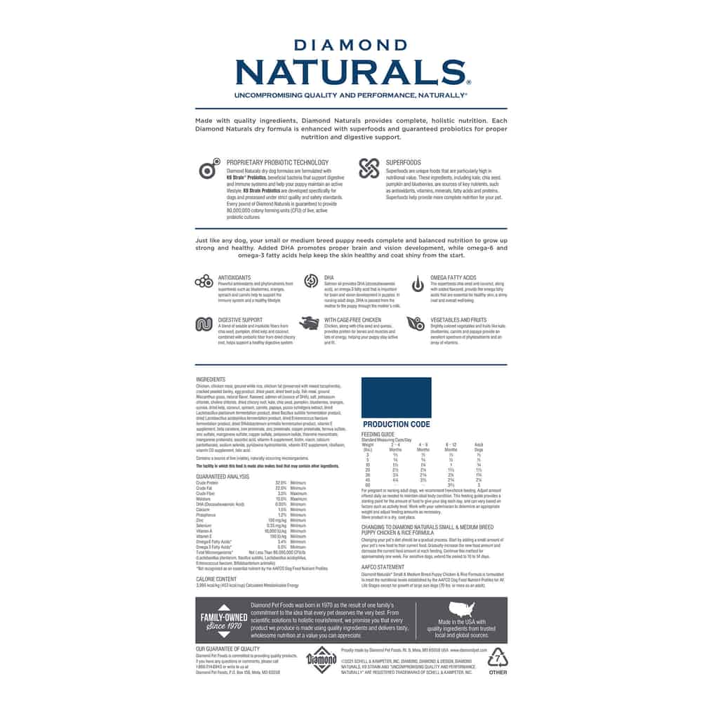 | Diamond Naturals Small & Medium Breed Puppy Chicken & Rice Formula is formulated to meet the nutritional levels established by the AAFCO Dog Food Nutrient Profiles for All Life Stages except for growth of large size dogs (70 lbs. or more as an adult). |