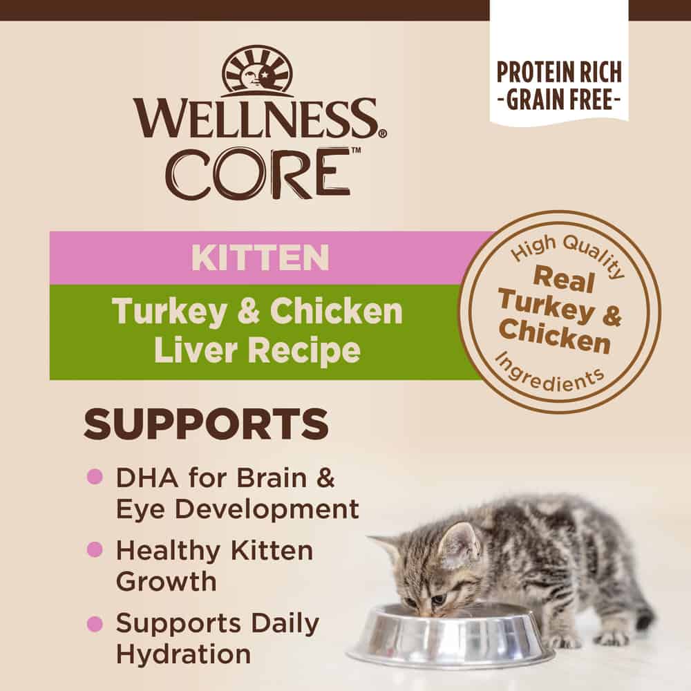 - HIGH-PROTEIN & GRAIN-FREE WET KITTEN FOOD: Wellness CORE delivers the meat that your kitten craves in a complete and balanced diet. Each recipe is grain-free and fortified with vitamins and minerals to ensure your cat has the nutrition they need to thrive.