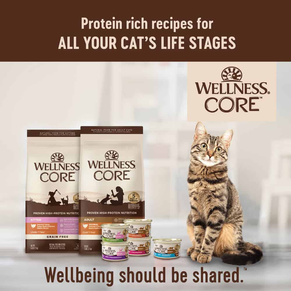 Wellness CORE is based on the nutritional philosophy that cats, given their primal ancestry, thrive on a diet mainly comprised of meat. Wellness CORE pate canned wet cat food naturally delivers the protein rich variety your cat craves from a robust selection of delicious recipes your cat is sure to love. Wellness wet cat food does not contain any added carrageenan, wheat, wheat gluten, corn, soy, artificial colors, or preservatives.