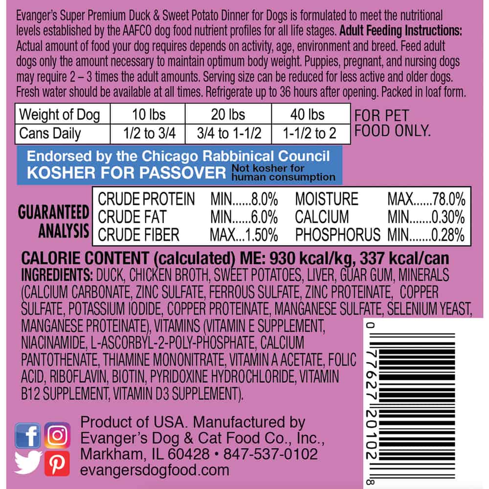Evanger's Duck & Sweet Potato Dinner is formulated to meet the nutritional levels established by the AAFCO nutrient profiles for all life stages. Puppies, pregnant and nursing dogs may require 2-3 times above amounts, and reduced for less active or older dogs. Amount of food your dog requires depends on activity, age, environment and breed. Duck & Sweet Potato Dinner is certified Kosher for Passover by the cRc.