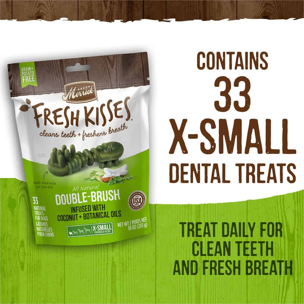- Merrick Fresh Kisses Dog Dental Chews For Extra Small Breeds, Grain Free Dog Treats, Coconut, Botanical Oils