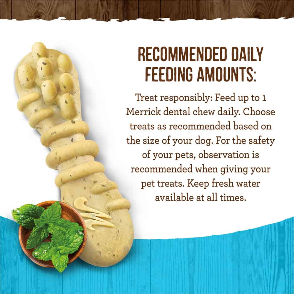 - Merrick dog treats that feature a unique double brush design are perfect for dog teeth cleaning and as a dog breath freshener like no other dog dental treats
