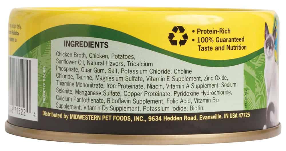 | Chicken Broth, Chicken, Potatoes, Sunflower Oil, Natural Flavors, Tricalcium Phosphate, Guar Gum, Salt, Potassium Chloride, Choline Chloride, Taurine, Magnesium Sulfate, Vitamin E Supplement, Zinc Oxide, Thiamine Mononitrate, Iron Proteinate, Niacin, Vitamin A Supplement, Sodium Selenite, Magnesium Sulfate, Copper Proteinate, Pyridoxine Hydrochloride, Calcium Pantothenate, Riboflavin Supplement, Folic Acid, Vitamin B12 Supplement, Vitamin D3 Supplement, Potassium Iodide, Biotin. |