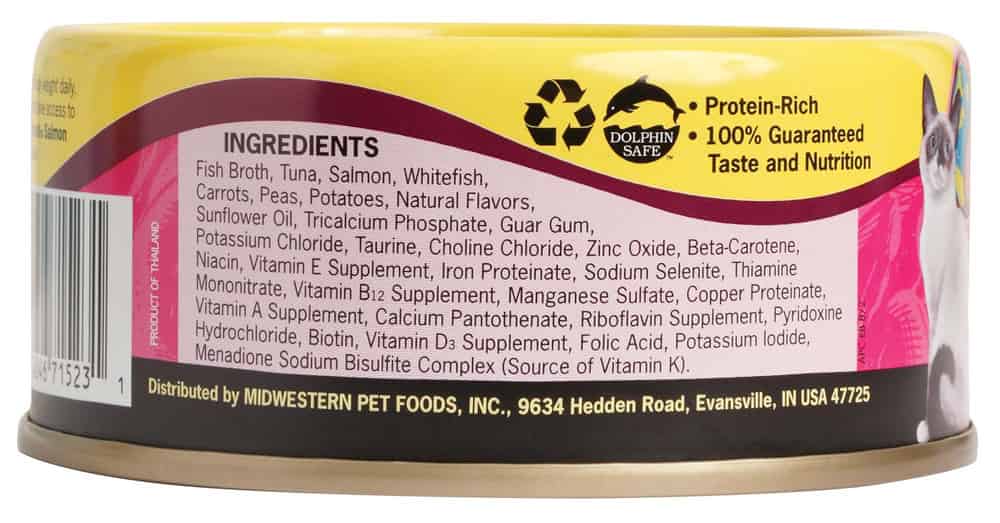 | Fish Broth, Tuna, Salmon, Whitefish, Carrots, Peas, Potatoes, Natural Flavors, Sunflower Oil, Tricalcium Phosphate, Guar Gum, Potassium Chloride, Taurine, Choline Chloride, Zinc Oxide, Beta-Carotene, Niacin, Vitamin E Supplement, Iron Proteinate, Sodium Selenite, Thiamine Mononitrate, Vitamin B12 Supplement, Manganese Sulfate, Copper Proteinate, Vitamin A Supplement, Calcium Pantothenate, Riboflavin Supplement, Pyridoxine Hydrochloride, Biotin, Vitamin D3 Supplement, Folic Acid, Potassium Iodide, Menadione Sodium Bisulfite Complex (Source of Vitamin K). |