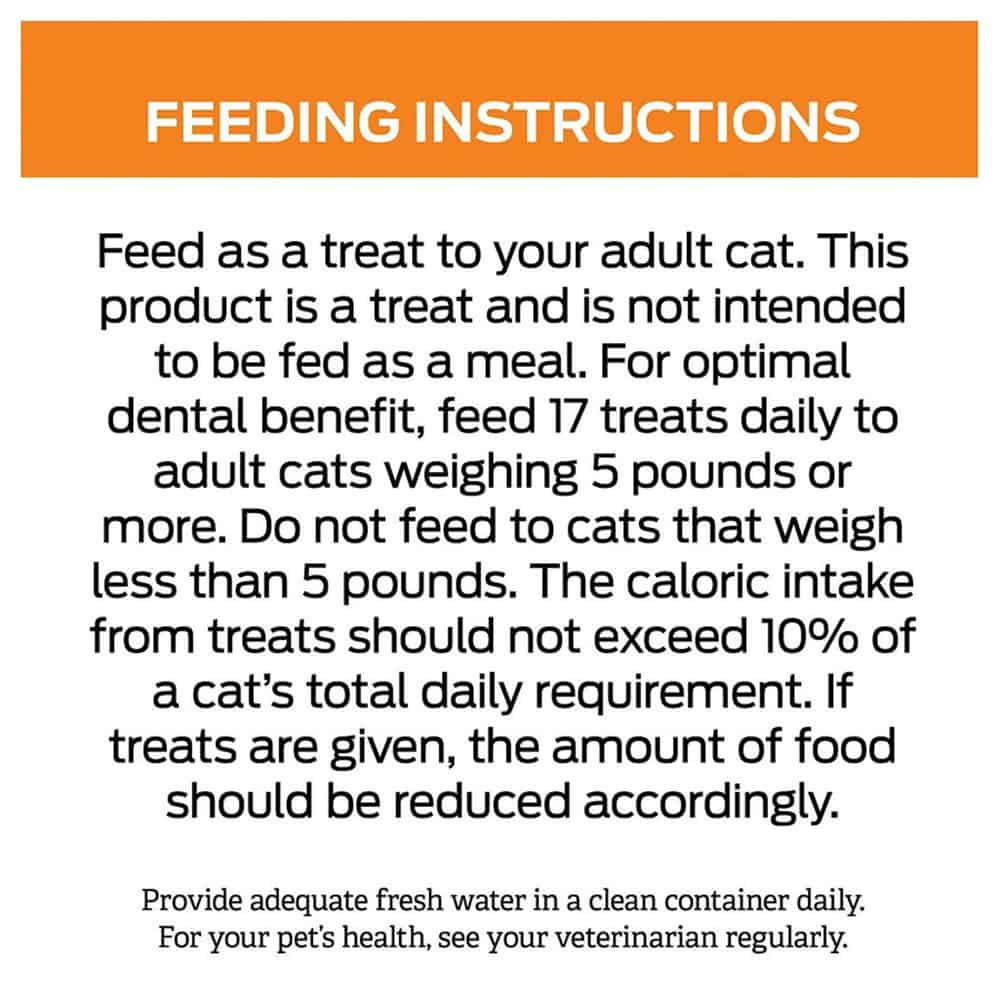 - For optimal benefit, feed 17 treats daily to adult cats weighing 5 pounds or more.